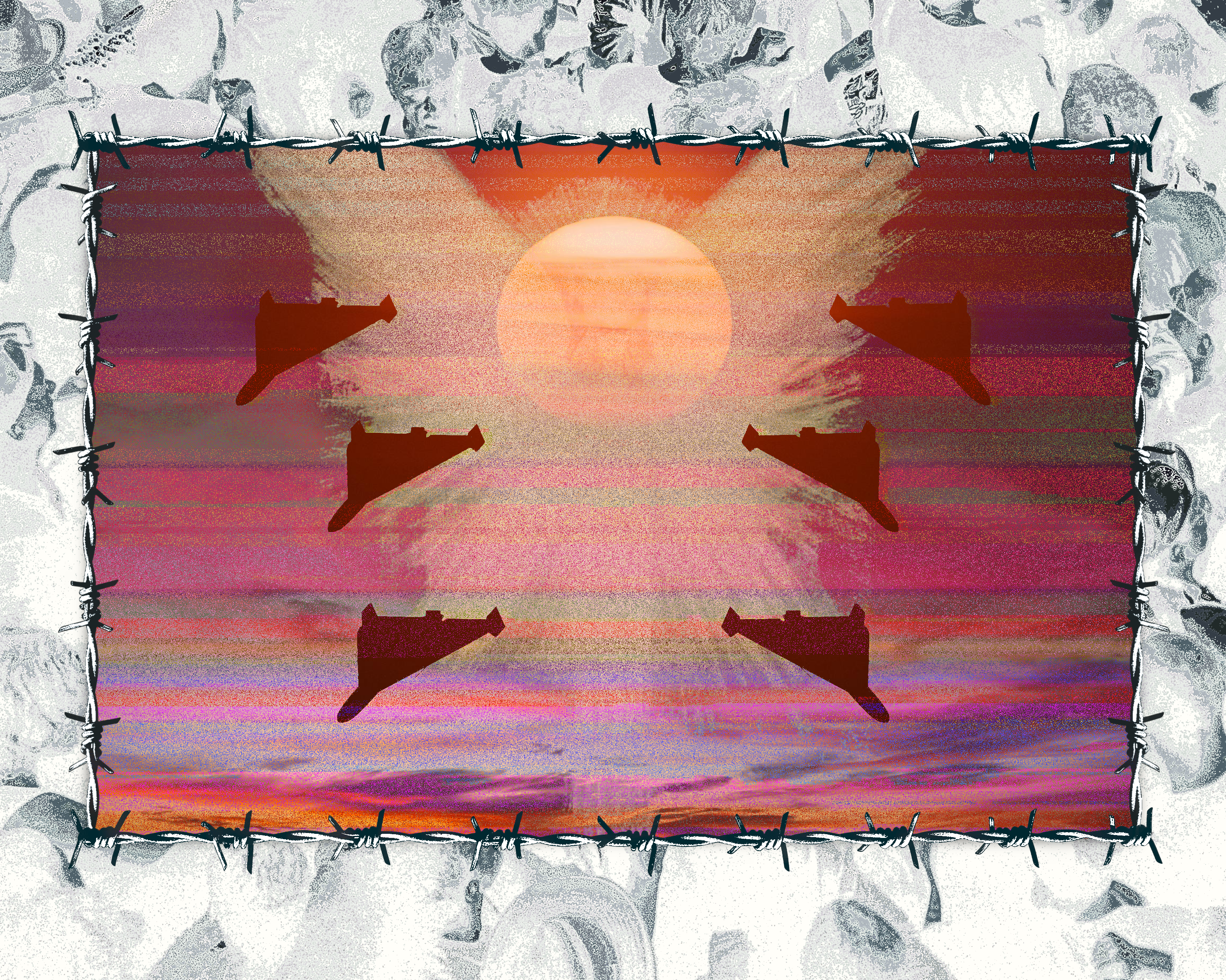 references to popular mobilization and sovereignty abound throughout this piece of glitch artwork alongside subversions of hegemonic iconography that gesture towards free association and impermanence. it coalesced out of simultaneous desires to interpolate an earworm by the breakout act, “geese,” and intertwine anti-imperialist principles with the practice of transformative self-portraiture. the ærial scene features six shahed drones flying through a twilight sky and flanking a specter through which the sun is visible. azræl, the angelic figure whose name means “god’s help,” is traditionally associated with mortality in the abrahamic milieu. portrayed as manifesting during the crepuscular period, a liminal interval that connotes radical change, he heralds the end of empire, property, and alienation. visual artifacting generated using nick briz’s huffman hacking tool further narratively emphasizes the disruption of established authority, hijacking the vulgar apocalypticism informing prevalent nationalist ambitions. moreover, the iranian unmanned combat ærial vehicles (ucavs) function as an allegory for the triumph of use value over the profit motive. their cost-effective deployment against sophisticated american and israeli targets is an indictment of the western military industrial complex as a wealth extraction front. barbed wire, often used for borders, incarceration, and warfare, frames this portion of the composition. this material serves as a vector of conflict and also creates an illusion of physical depth. surrounding this as a background image is the outer edges of a bird’s-eye view of a crowd in inverted greyscale. at once, this conveys estrangement through æsthetics and indicates the emancipatory intersubjective potential of embracing open borders in every sense and abolishing the commodity form.