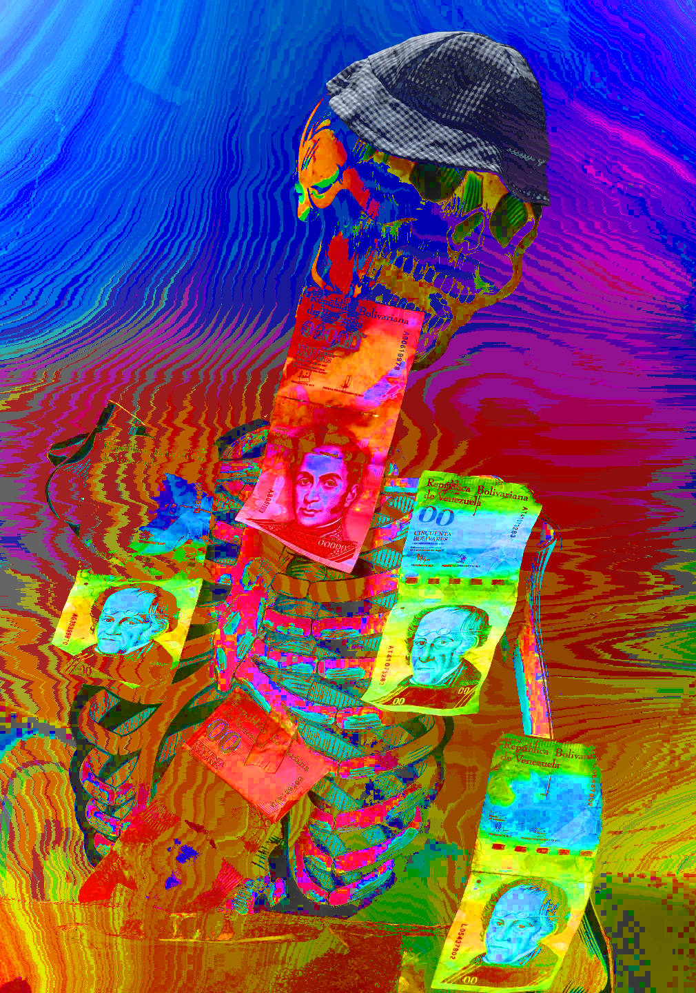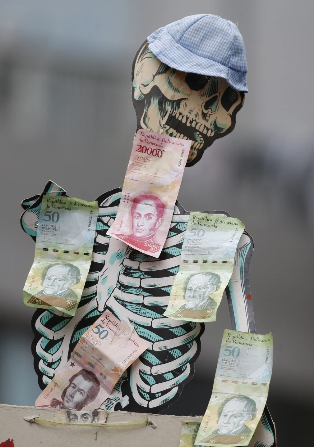 the reference image for this work features a piece of inflation art photographed at a 2020 march for better living conditions in caracas, the capital of venezuela. culminating in the united states military unlawfully abducting their head of state under the direction of donald trump, the citizens of this south american nation have faced over two decades of continuously worsening material hardship as a consequence of sanctions, piracy, and military incursions devised to undermine their self-determinative efforts. this sculpture comprises a paper cutout skeleton with a hat on its head and several units of paper money - four bolívares fuertes (“strong/hard bolivars”) and one bolívar soberano (“sovereign bolivar”) - clothing its torso.