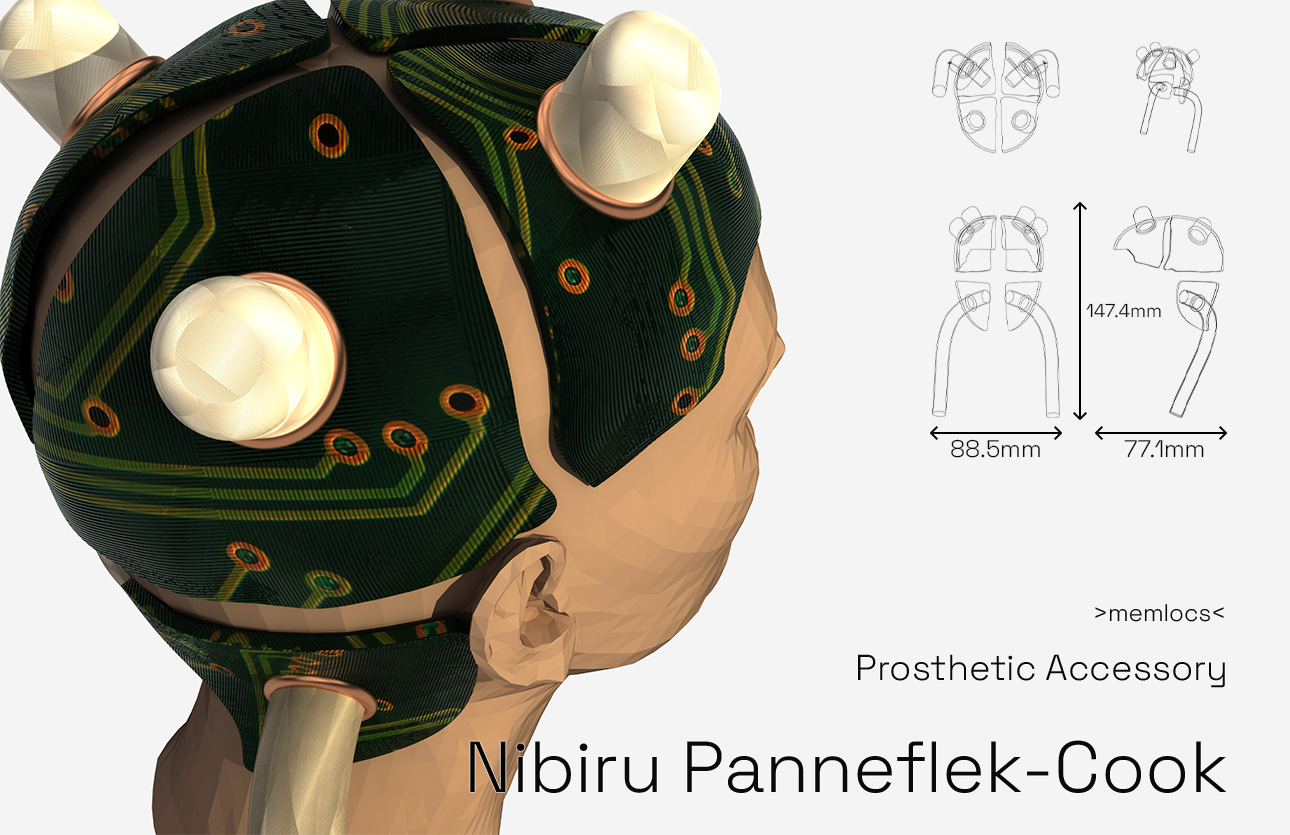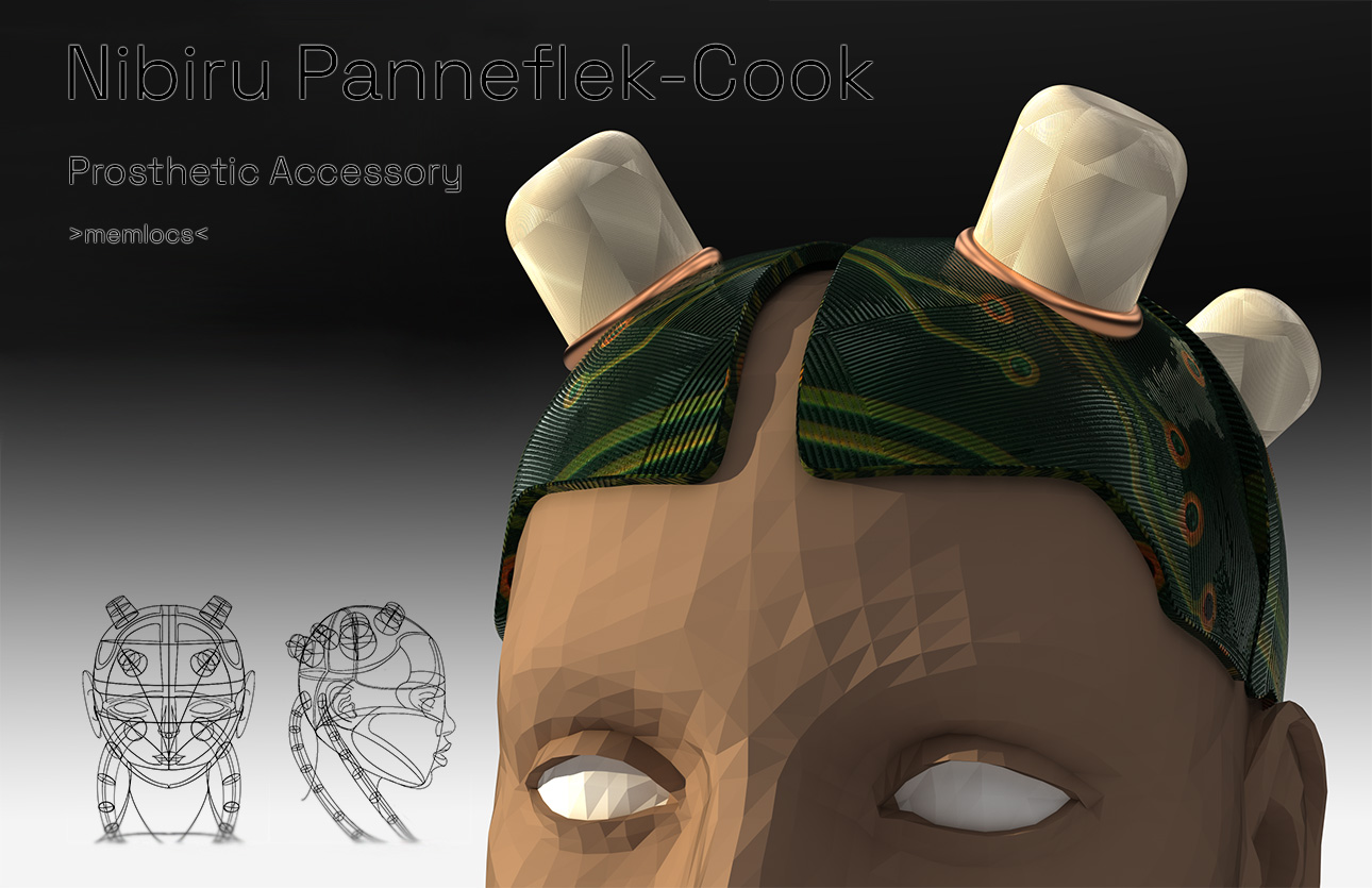 envisioned as hybrid cranial and neuroprosthetics that utilize deep brain stimulation to fulfill their intended purpose of external mental storage, >memlocs< offer an afrofuturist outlook on a posthuman world to come. these bionic enhancements aim to go beyond the functionality of their medical and cosmetic predecessors by granting their wearers pseudo-telepathic abilities in the form of remote synaptic connectivity with each other, resulting in heightened semantic interference thresholds, more efficient processing, and improved recall. equal parts treatment and fashion, this technology is well-suited to an exceedingly wide range of applications encompassing cranioplasty, cosmesis, and cooperative data management.