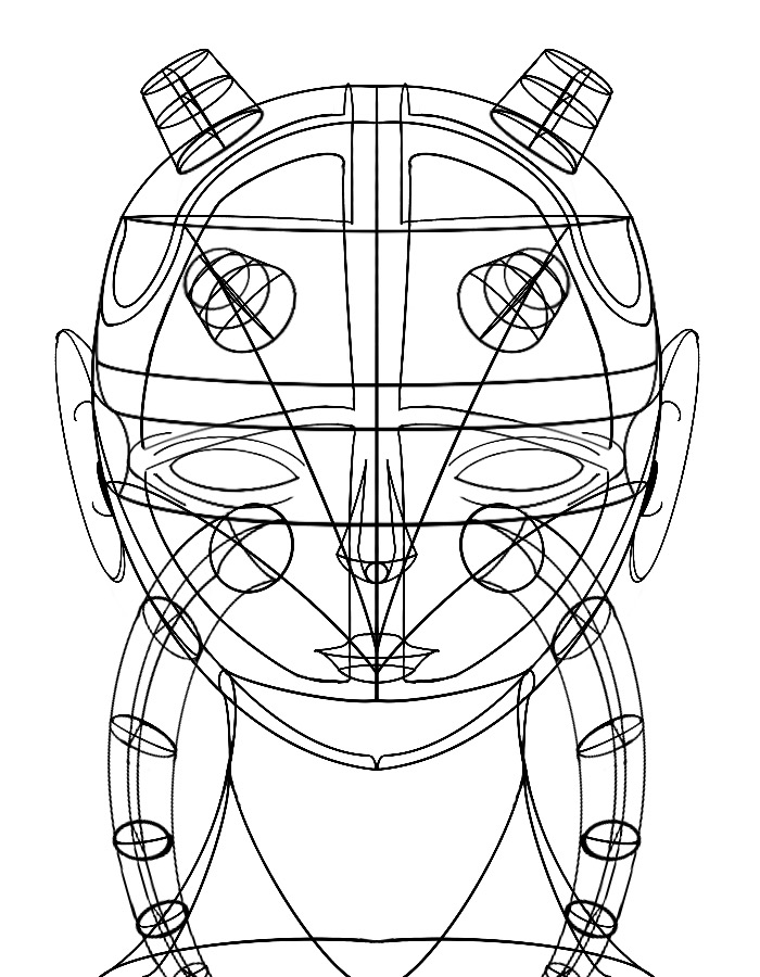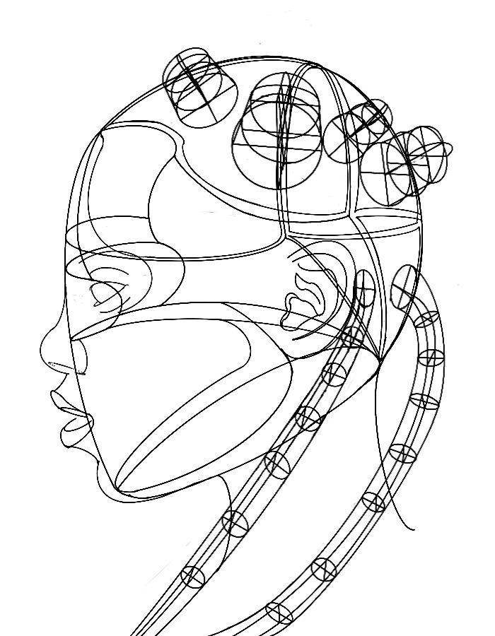 at the outset of this project, i imported prototype drawings i made in procreate into rhino 8 using the "picture" command. to create the base plates for the implants, i used my gesture lines as guides to draw curves around the circumference of a pre-made head model, turned them into surfaces using the "patch" command, and offset them by 0.75 units. next, i generated cylindrical primitives, filleted them, and manipulated their scales and positions to mirror the Bantu knot nodes as depicted in my sketches. for expediency, i sourced and modified a sketchfab asset to help articulate the braided cords. afterward, i placed toruses at the base of each protrusion to imbue the sum of their parts with polish and elegance.